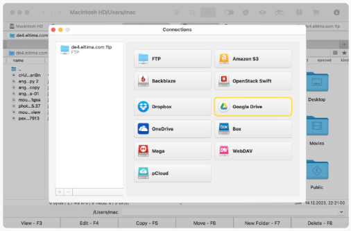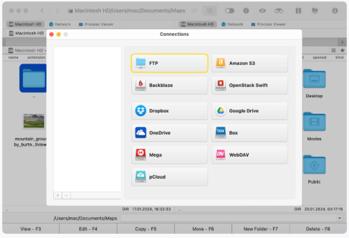 Commander One 简化了文件传输,允许您将云账户和远程服务器映射为网络驱动器,无需将文件复制到电脑。