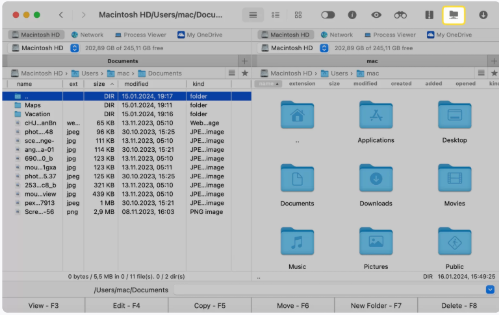 现在,你可以在《Commander One 》的双面板窗口中查看并传输你的文件和文件夹